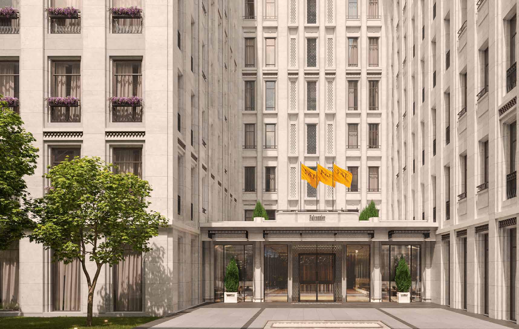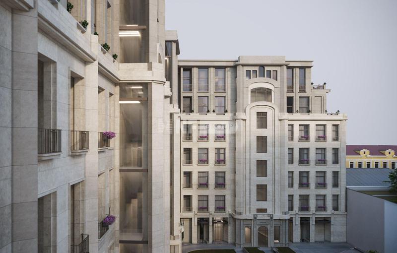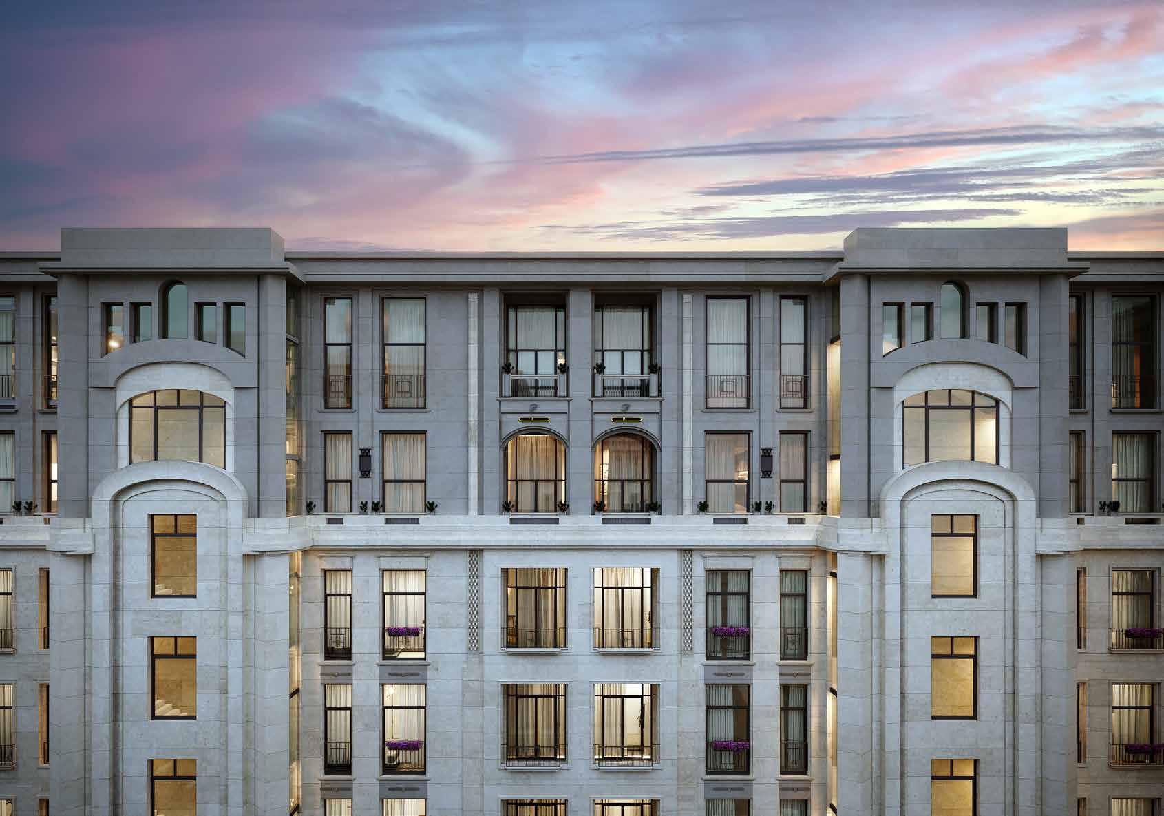 Архитектурное решение отсылает к канонам стиля модерн: отказ от строгой геометрии в пользу плавных линий и органичных форм, вдохновлённых природой. Натуральный камень и стеклянные вставки на фасаде усиливают эту концепцию, а просторные террасы на верхних уровнях вносят нотку утончённости и легкости в общий облик здания.