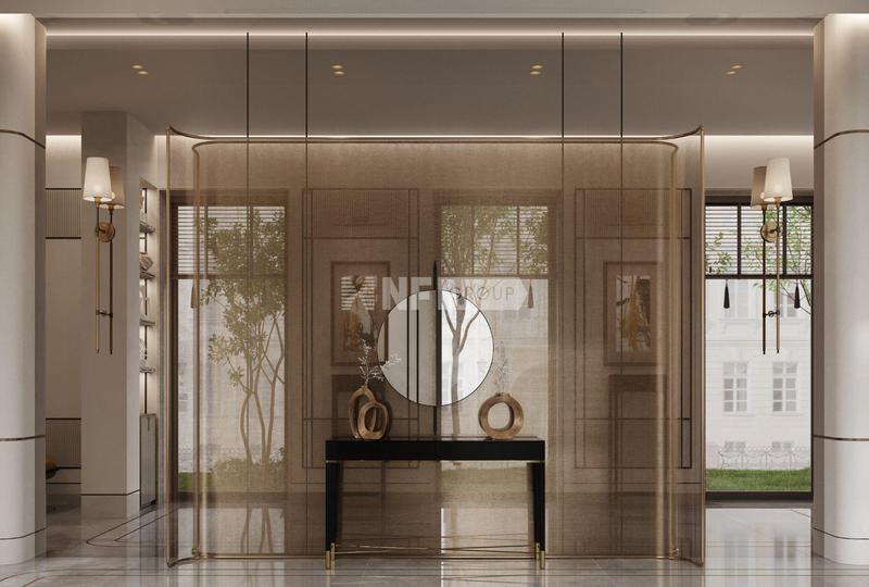 В интерьере ощущается дыхание модных тенденций прошлого века: в отделке преобладают стеклянные и зеркальные элементы, отсылающие к эстетике минувших лет. При бережном отношении к историческому облику, комплекс гармонично сочетает это с полным набором комфортов, необходимых для жизни в XXI веке.